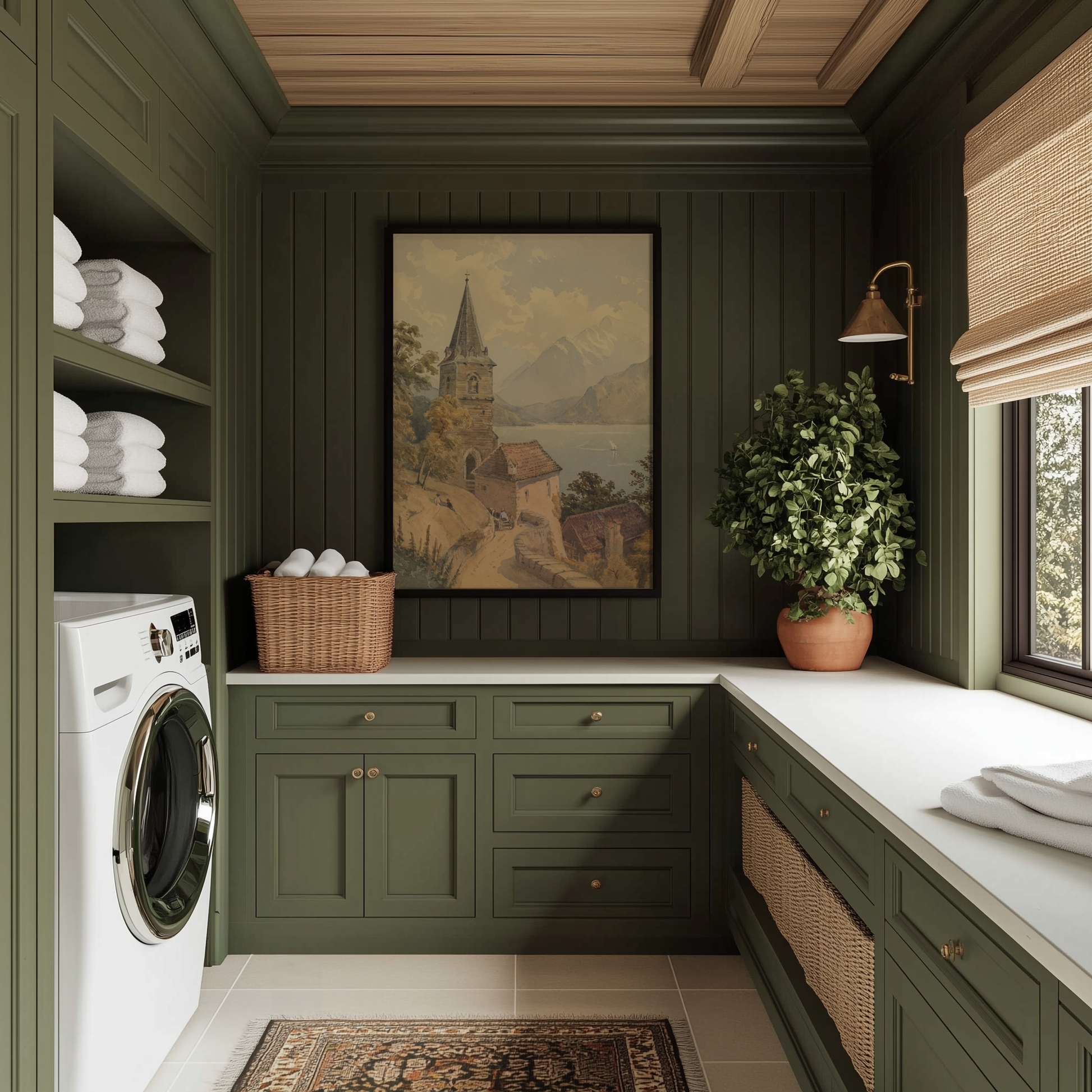 Serene lakeside views set against a dramatic mountain backdrop, this old-world European painting of soft blues, greens and warm neutrals blend to create a calm palette.