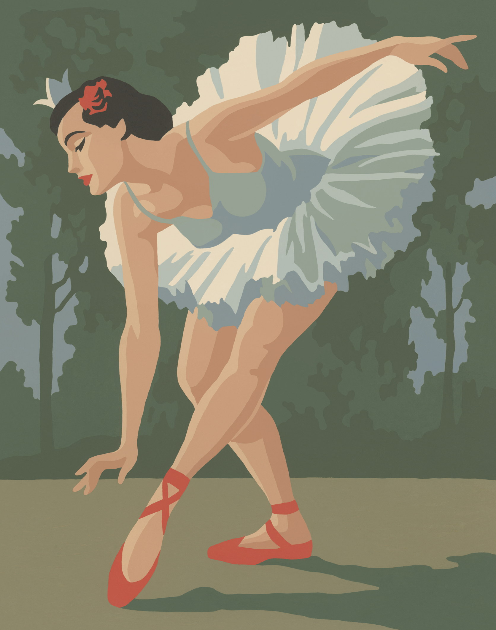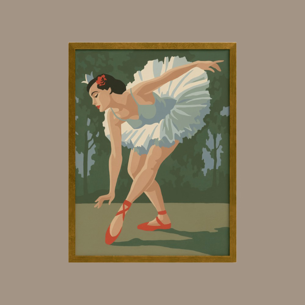 A striking mid century artwork capturing the beauty and elegance of ballet. Beatrix is rendered in a vintage palette of soft blues, creams and muted greens. Pairs perfectly with her sister print Agnes.