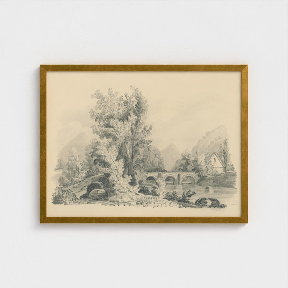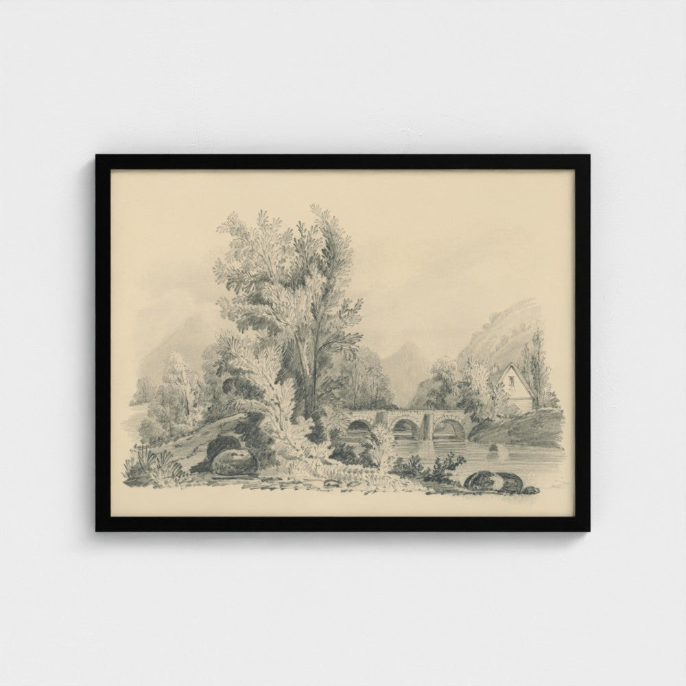 A simple landscape pencil sketch dating from 1839. A charming countryside scene, capturing views across the riverbank to a small cabin. Artist unknown.
