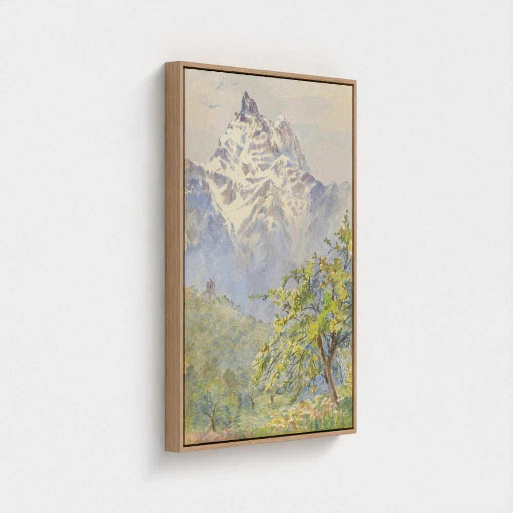 Majestic snow-capped peaks rising through the soft atmospheric mountain light, Summit Pass blends cool alpine tones with sunlit valley greens. A serene and peaceful landscape.