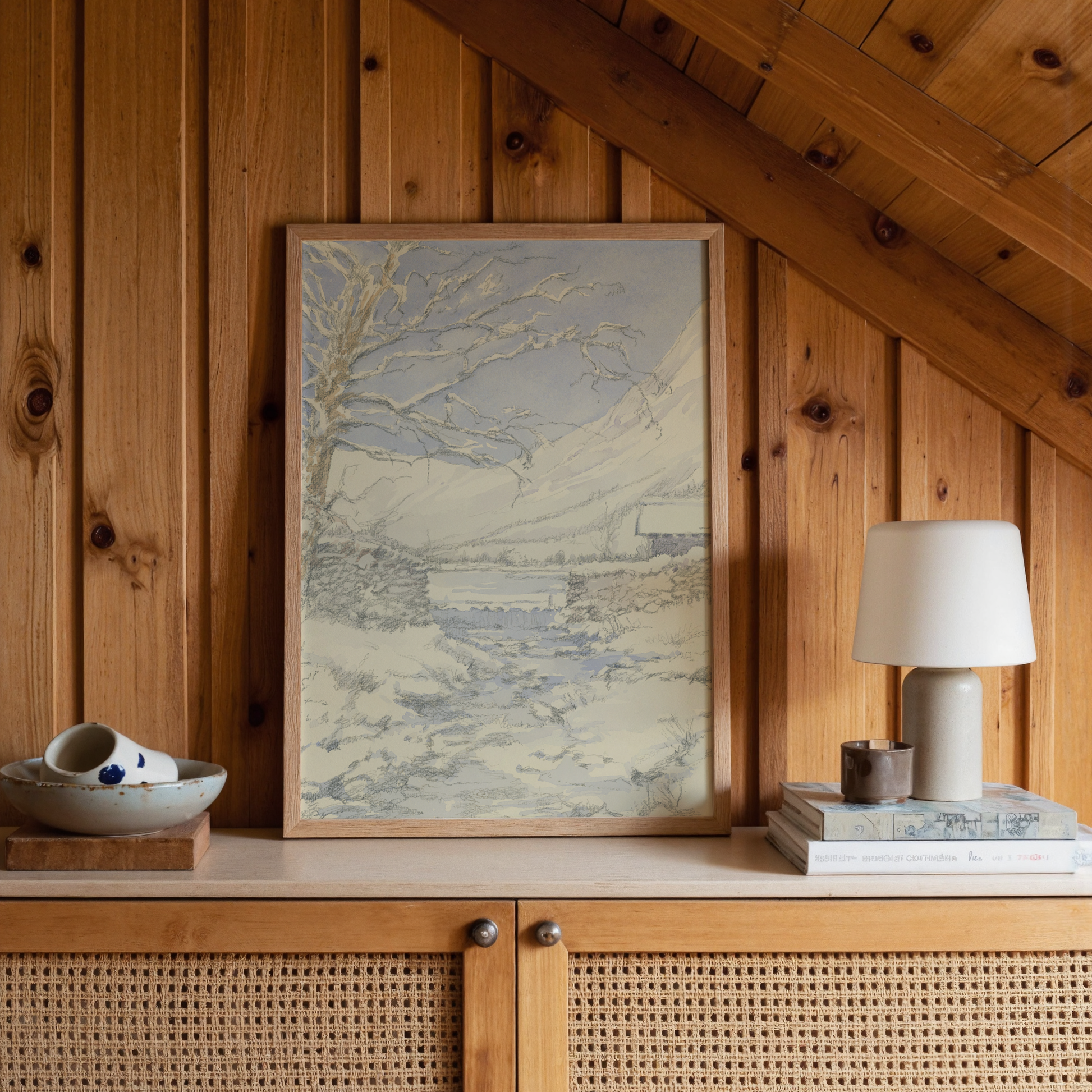 A snowy stillness falls over the high valley, soft wintery palette and gentle lines bring a sense of calm and peace, offering a visual pause for the everyday pace of life.
